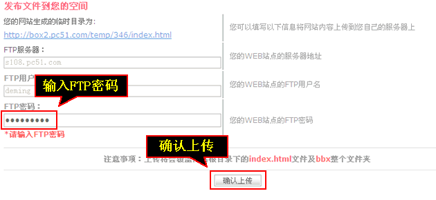 输入“FTP密码”点击“确认上传”。