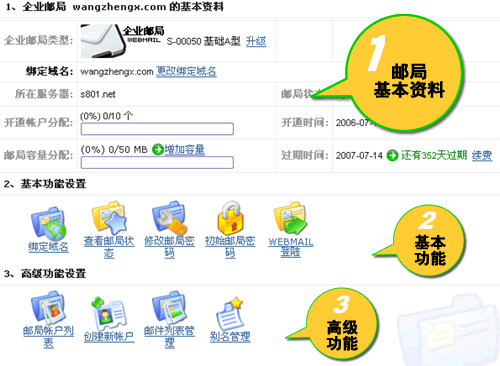 3、这样即可进入邮局的功能管理页面,页面说明如下: